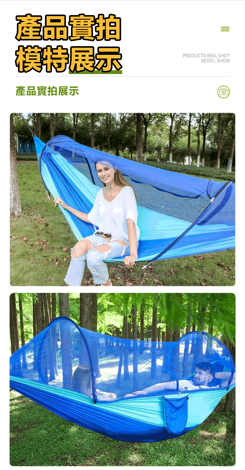 7分鐘前全自動速開戶外帶蚊帳吊床 - 【創意嘗鮮】承重700公斤 速開蚊帳吊床【帶蚊帳 三米綁繩 8號扣】/1入組NT$1298