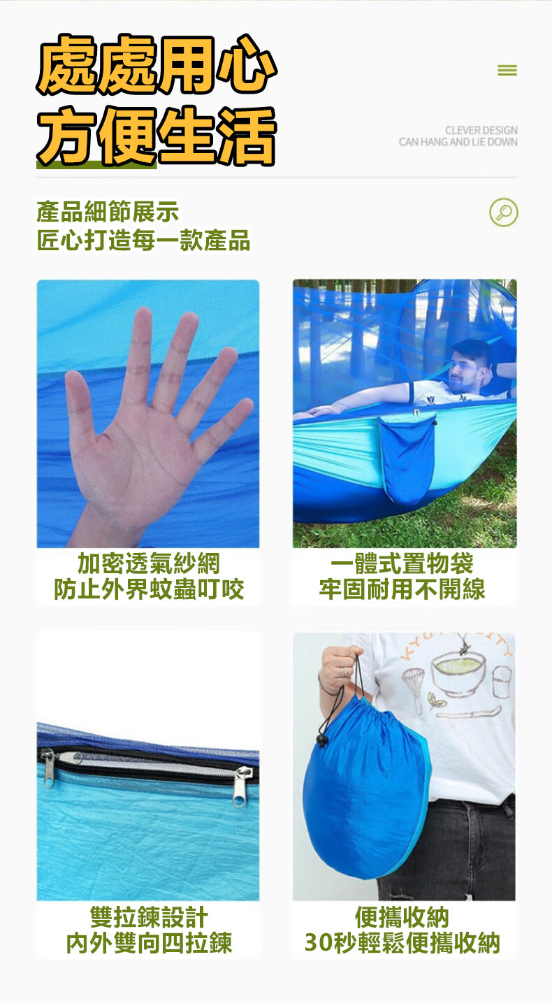 12分鐘前全自動速開戶外帶蚊帳吊床 - 【創意嘗鮮】承重700公斤 速開蚊帳吊床【帶蚊帳 三米綁繩 8號扣】/1入組NT$1298