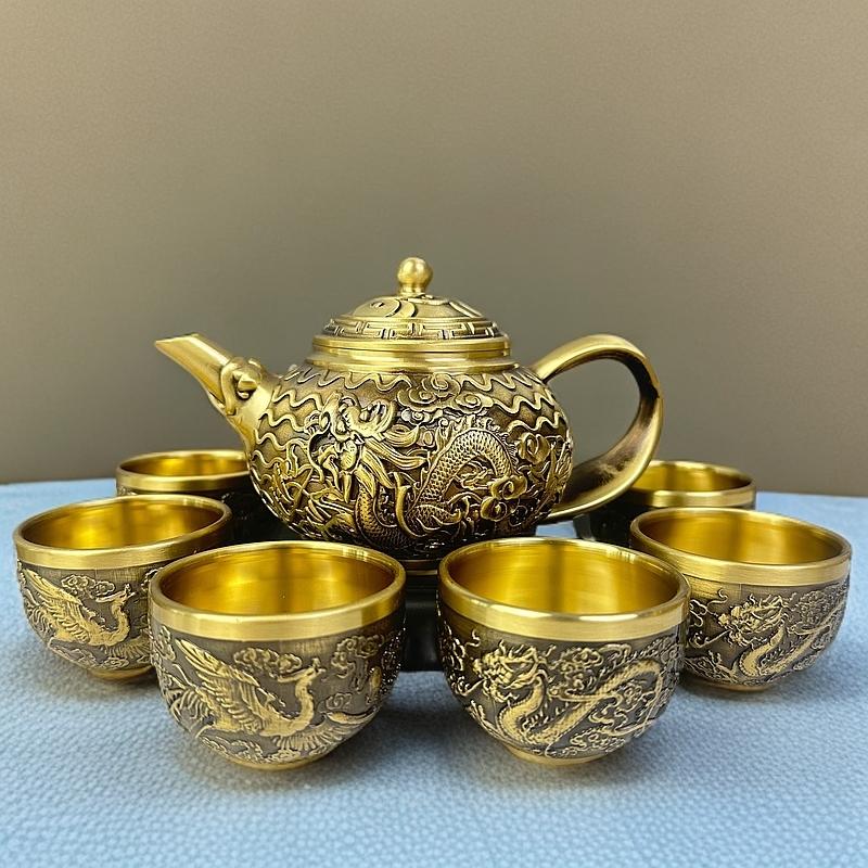 12分鐘前新款套裝【一壺八杯】中式浮雕黃銅龍鳳壺復古大容量龍嘴壺擺件 - 純黃銅茶具 龍鳳10件組【1茶壺8杯1底座】-NT$2698