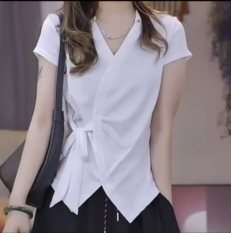 7分鐘前夏季新款重工不規則設計短袖時尚綁帶V領T恤女修身顯瘦上衣女 - 【新品特價】到手1件-NT$999